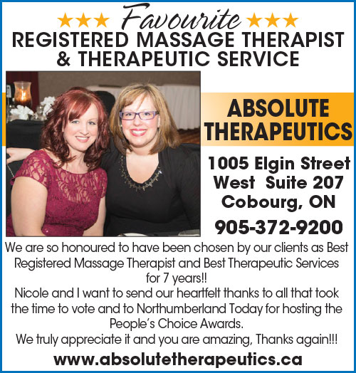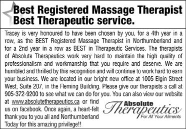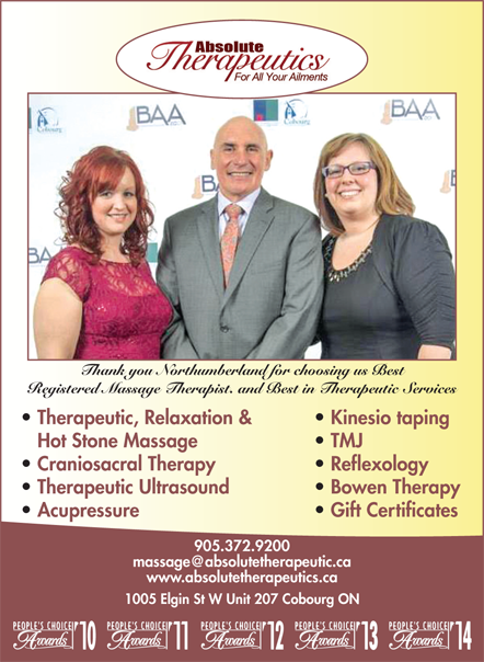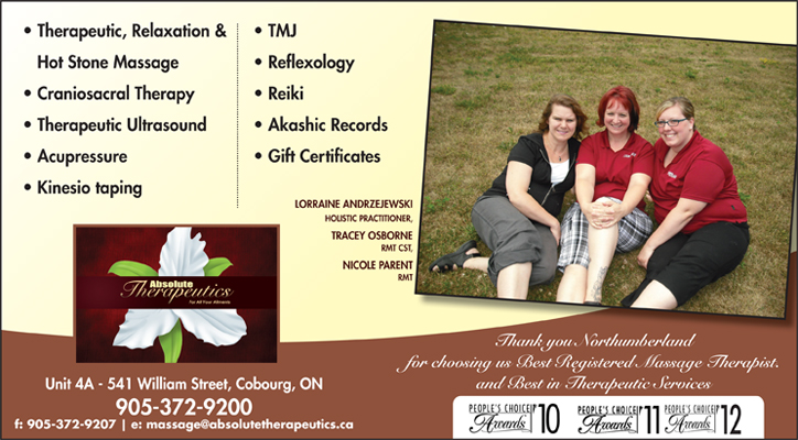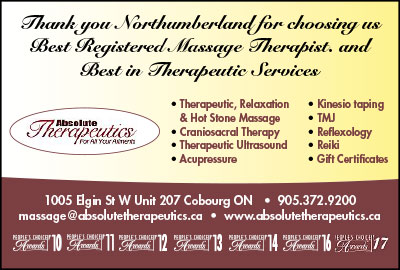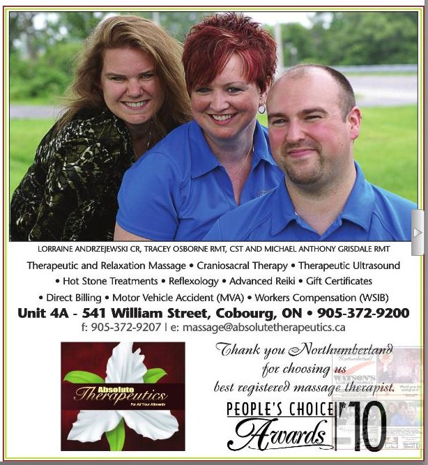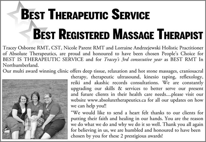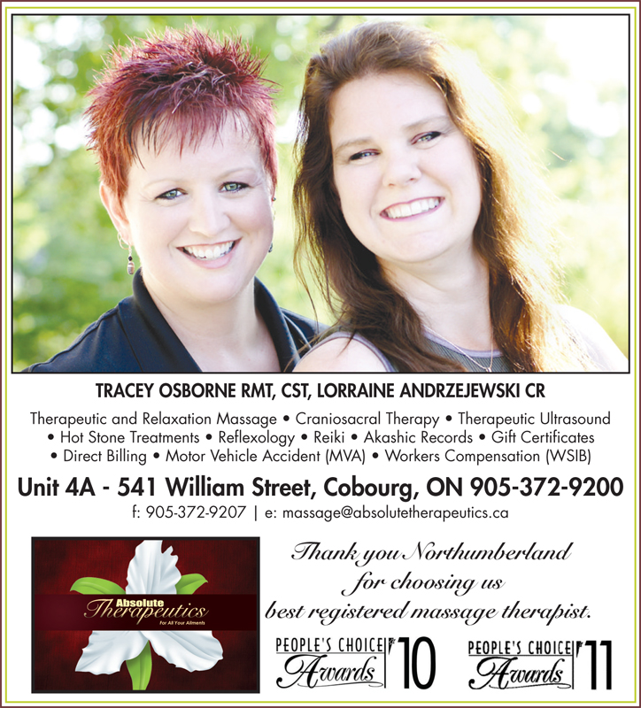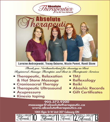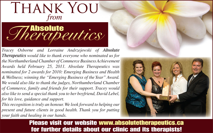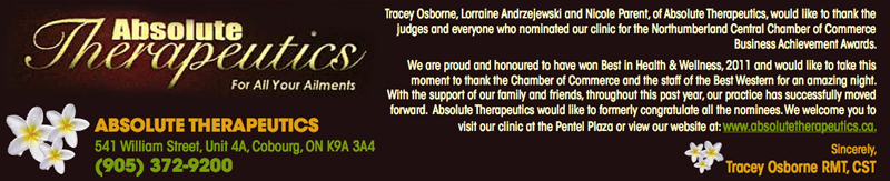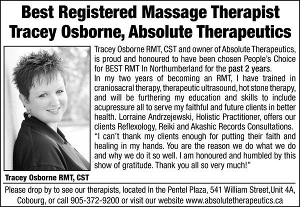 "As the owner of Absolute Therapeutics in the Town of Cobourg, Tracey Osborne is committed to excellence with a focus on individual care by offering unique services and convenience of accessibility to relieve pain and stress and to improve mobility. Since she opened her business in 2010, Osborne has won nine awards for her success and business contributions. Her community involvement is remarkable. She actively sits on a committee that helps local businesses thrive during an unstable economy; she educates high school and college students as a guest speaker; and participates in an average of three local charity events per year." - Premier Award