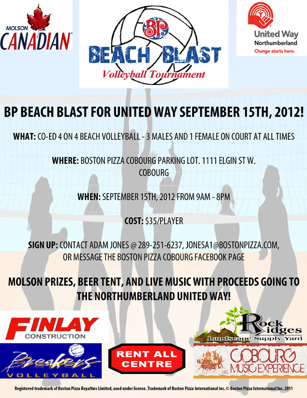 Third Picture: On Saturday, September 15, 2012, Boston Pizza is hosting a Beach Volleyball tournament to help raise money for the United Way. In an effort to help with this wonderful cause, Absolute Therapeutics will be providing massage and reflexology appointments for $20.00 throughout the day.