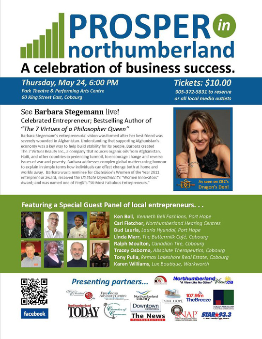 Tracey was honoured as one of 8 guest speakers at the Prosper in Northumberland Event held at the Park theatre and Performing Arts Centre on Thursday March 24, 2011 with Special guest Barb Steggmann, author of "The 7 Virtues of a Philosopher Queen".