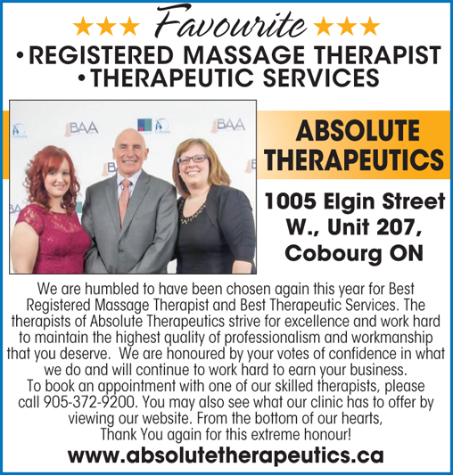 We are honoured and thrilled to have been voted by you as favourite Registered Massage Therapist and Therapeutic Service.