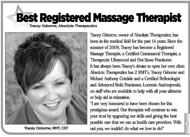 We are honoured and thrilled to have been voted by you as BEST IN THERAPEUTIC SERVICES 2013 and Tracey won Best Registered Massage Therapist 2013.